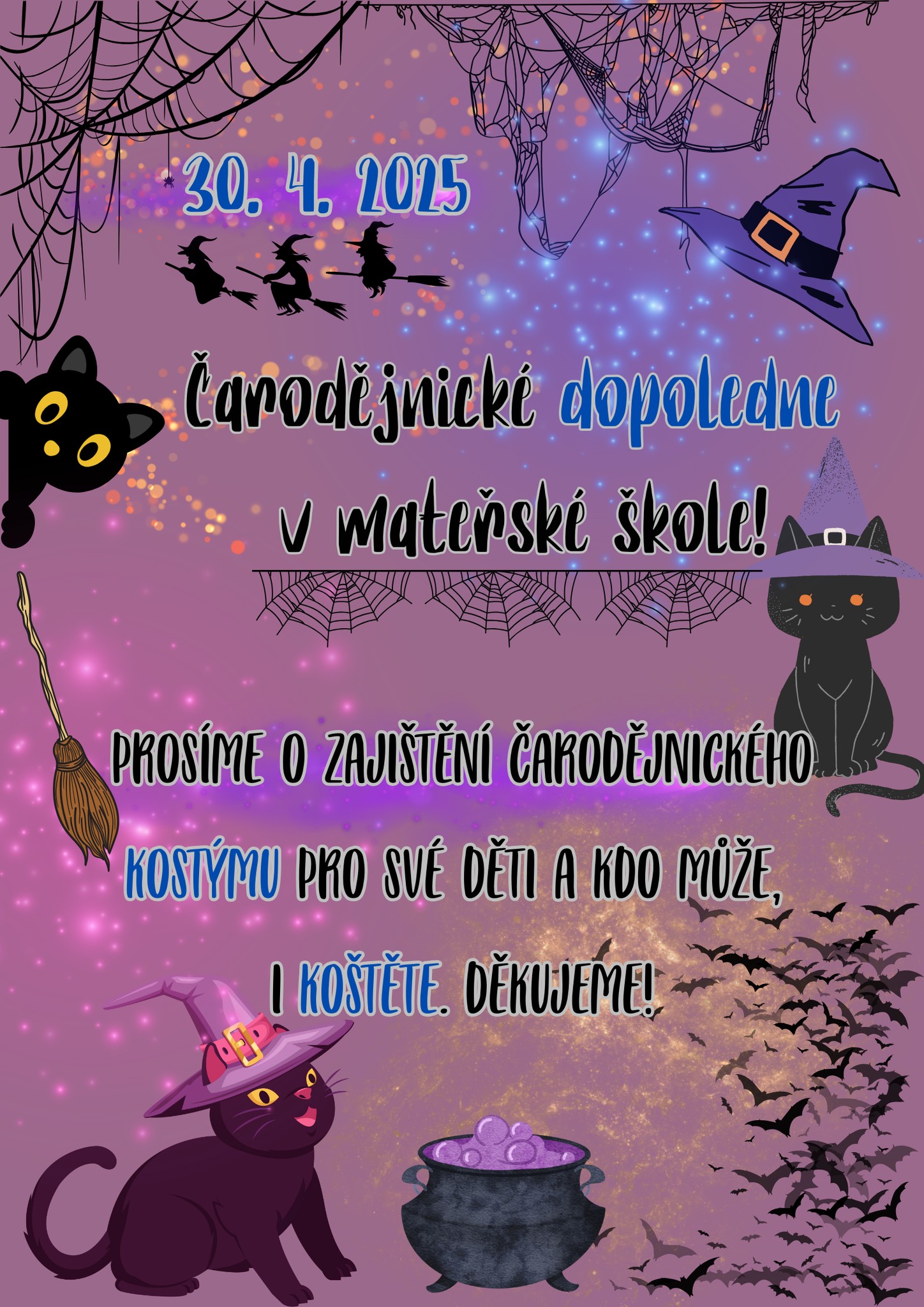 připravte dětem košťátka, oprašte čarodějné kostýmy, vzbuďte myšky a pavouky, ve školce budou ČARODĚJNICE!