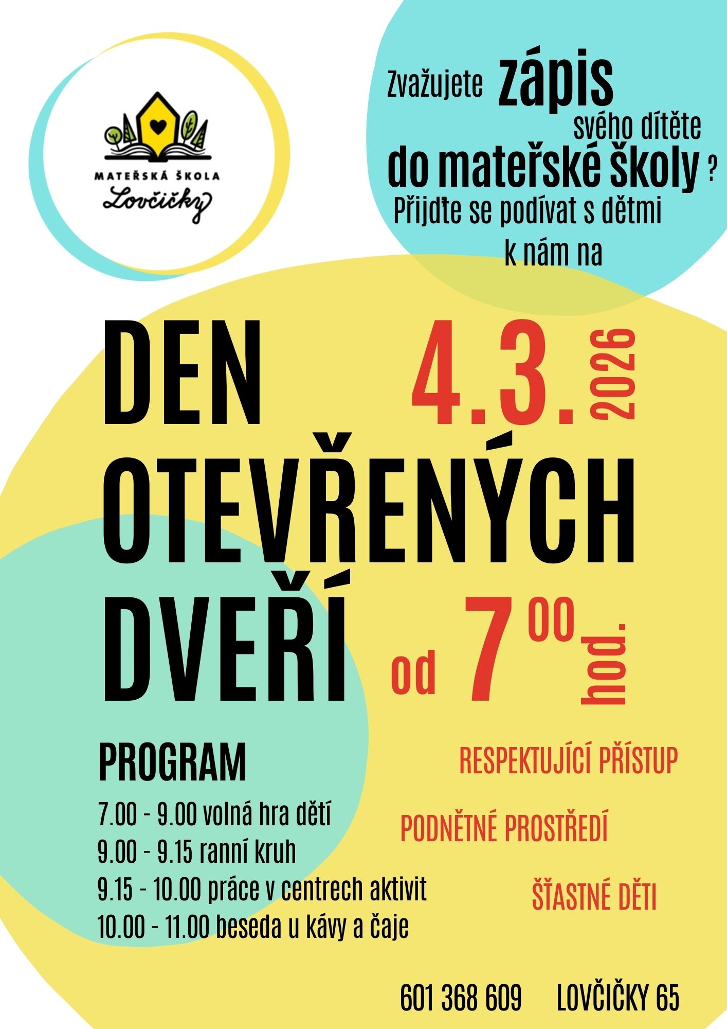 Hledáte tu nejlepší mateřskou školu pro své dítě? Přijďte se podívat k nám, zažijte atmosféru našich prostor, vyzkoušejte si dopolední vzdělávací program spolu se svým dítětem. Po vzdělávacím bloku bude prostor na dotazy, návrhy a příjemnou diskusi u kávy a čaje.
