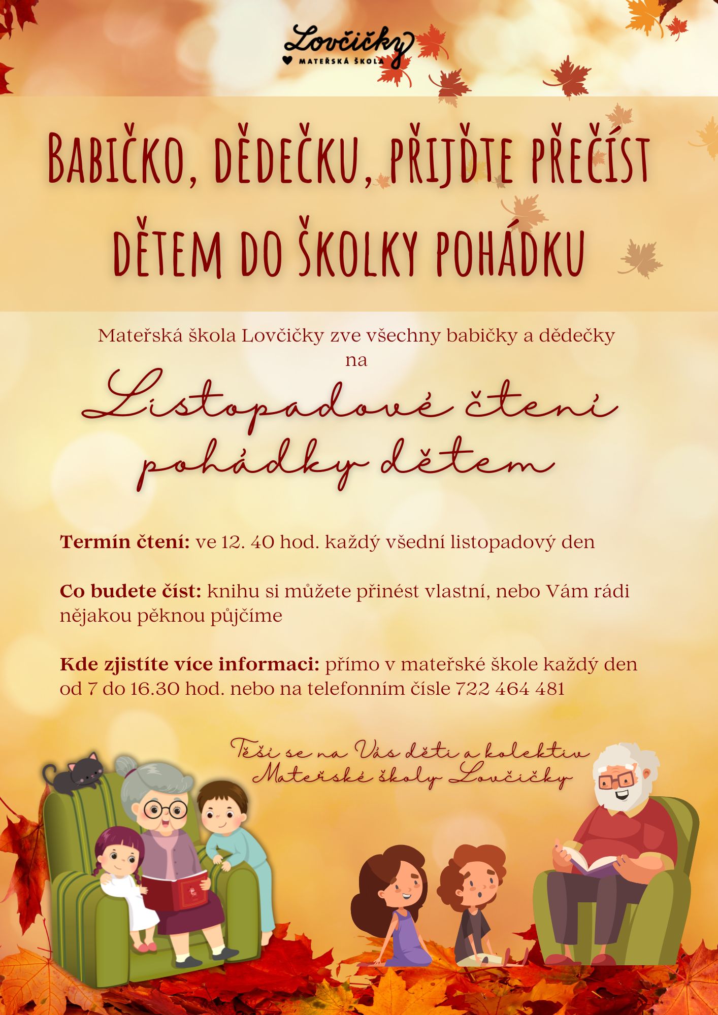 Stejně jako každý rok i letos zveme všechny babičky i dědečky na čtení dětem v naší školce. Nemusíte mít ve školce vnoučátko. Bohatě postačí chuť přijít za dětmi a strávit s nimi krásné chvíle nad příběhy z knihy.