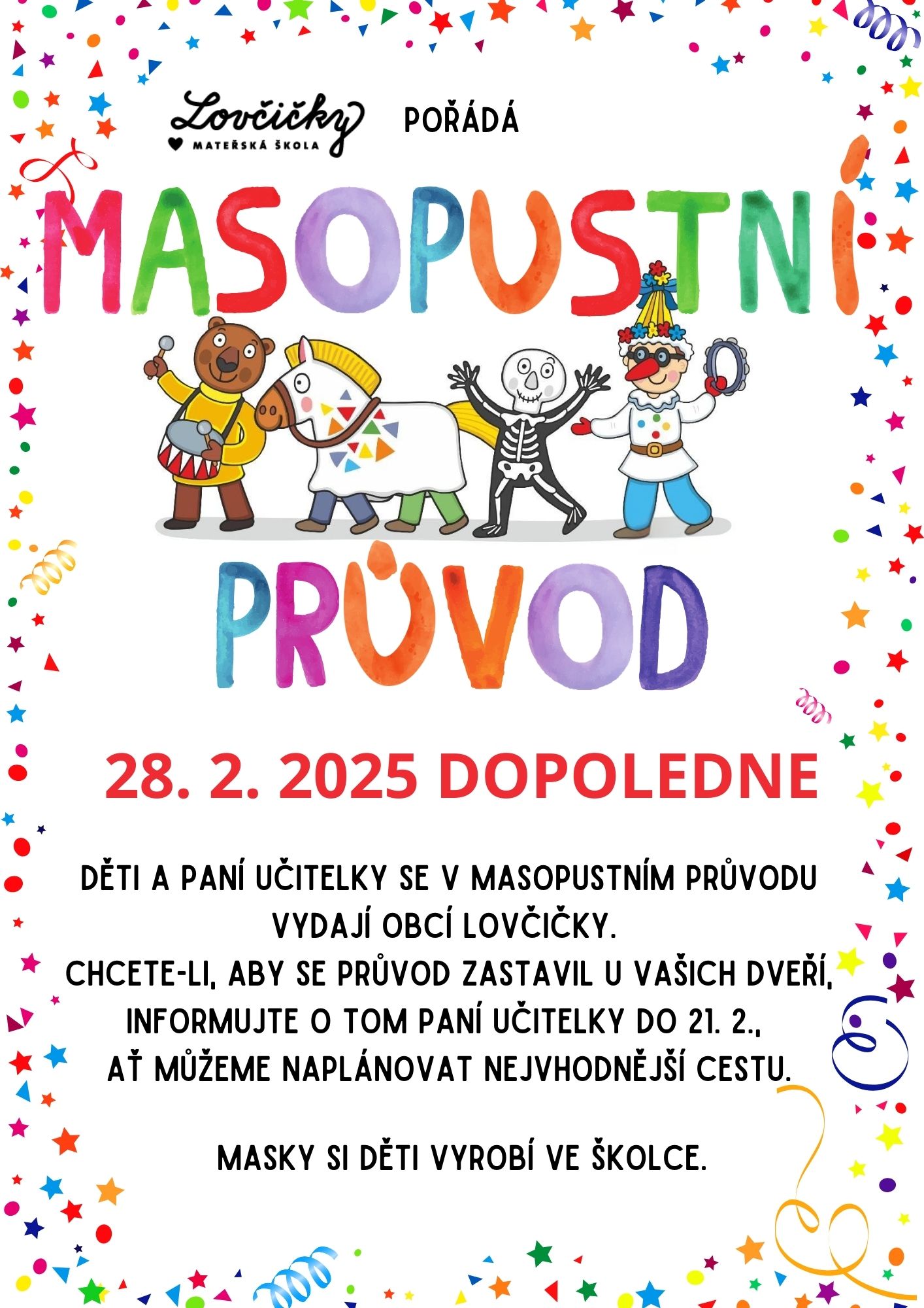 S dětmi se budeme připravovat na novou akci! Masopustní průvod obcí představuje tradice naší společnosti a zábavu v jednom. Chcete, aby se průvod zastavil u Vašich dveří?