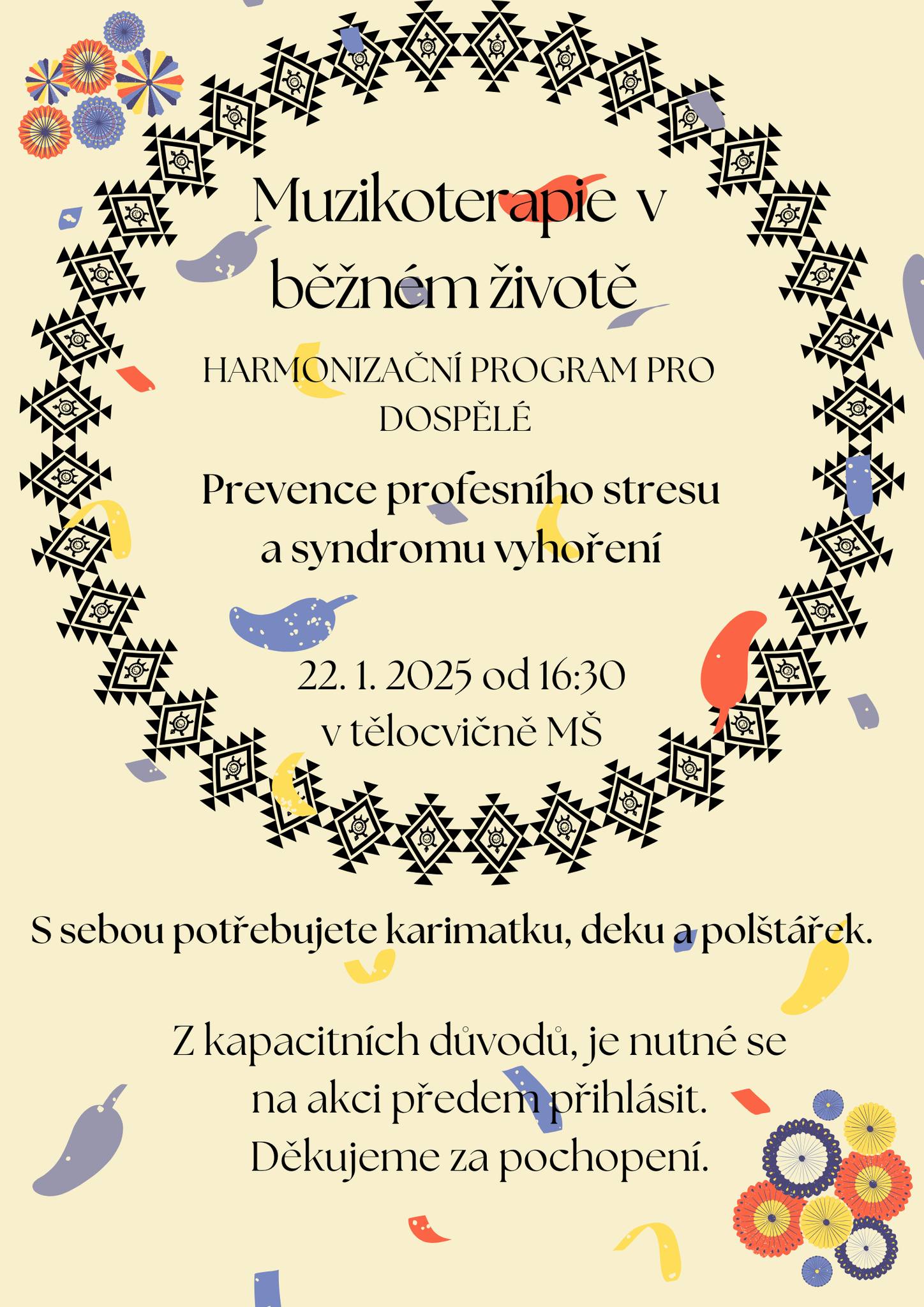 zveme Vás na relaxační hodinku ve školce za zvuků muzikoterapie. Odpočinete si, zrelaxujete tělo i mysl a uděláte velkou službu svému psychickému zdraví.