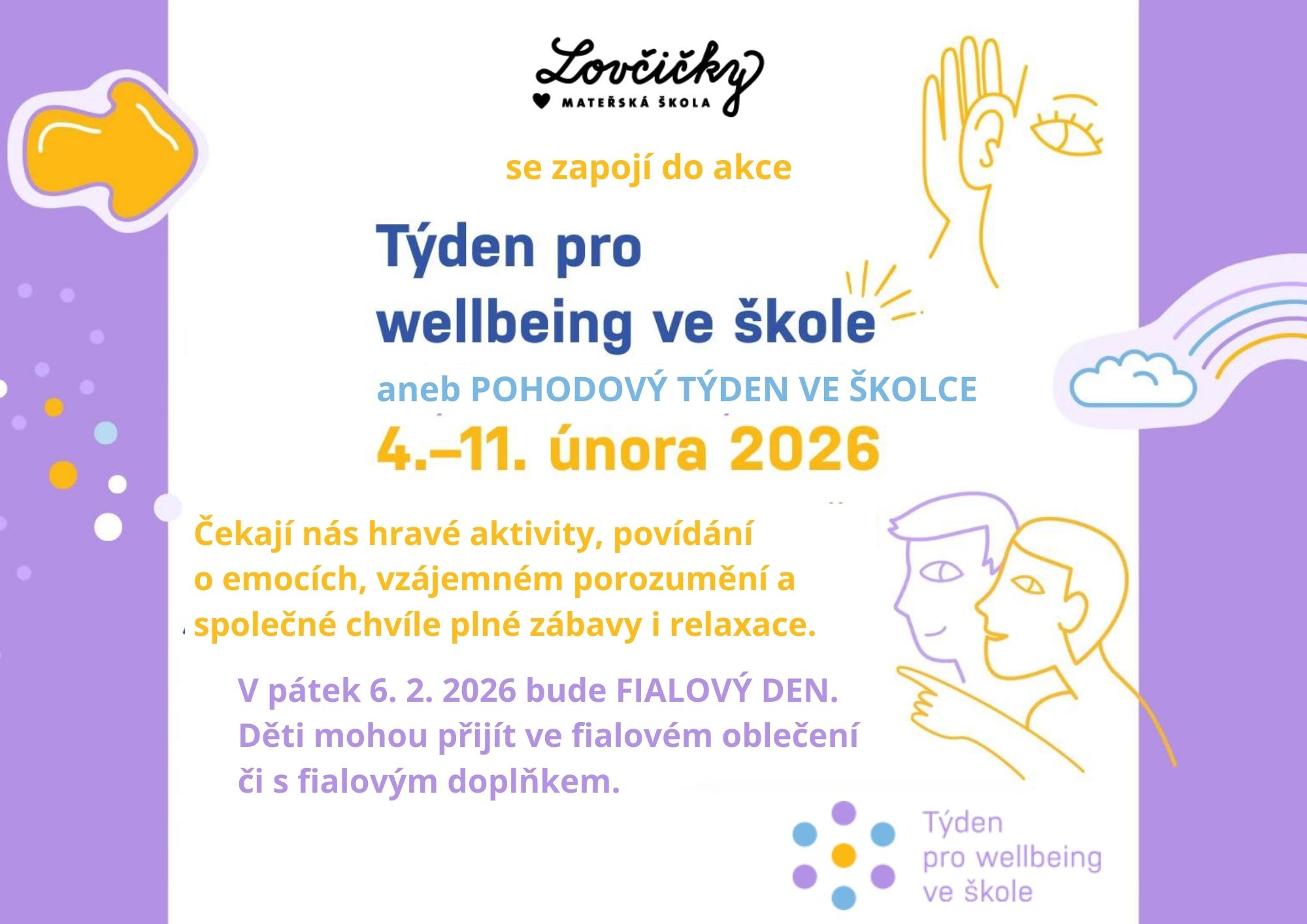 Chceme však zdůraznit, jak moc je podporující a vstřícné prostředí důležité pro vzdělávání i práci. Proto se s radostí připojujeme k Týdnu pro welbeing ve škole. 💜